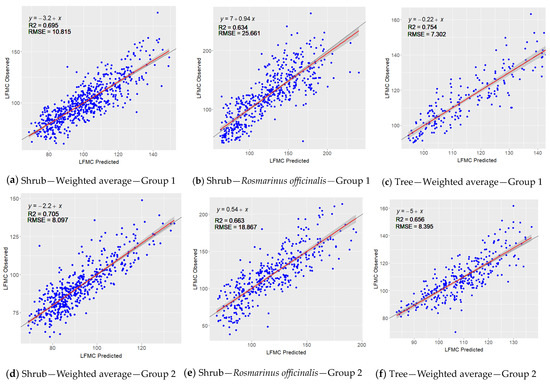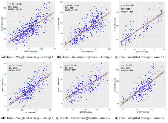 Figure 4 shows comparative graphs of the LFMC predictions and field-observed LFMC values for the different study groups. The black line represents slope 1 and the origin at 0, while the red line represents the regression line. The equations obtained for each case are described in the graphs. In all the models, the slope is very close to 1, while the intercept is close to zero. The coincidence of the linear regression line and the line representing slope 1 indicates that there was no significant bias in the model. However, in some plots, there seems to be a slight increase of the variance in the observed LFMC values as the mean increases.