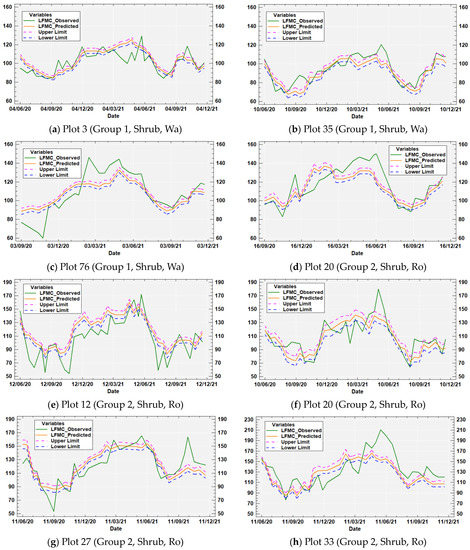 In the shrub plots of Figure 5a–h, we can observe how the proposed models reproduced a sharp decrease in LFMC values during the months of June, July, August, and September (dry season). Notice that, depending on the species considered, the LFMC range values in the Y-axis scale changes. The LFMC values of Rosmarinus officinalis were greater than those of the weighted average (obtained by considering all the species present in the plots and their fraction of canopy cover).