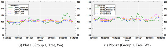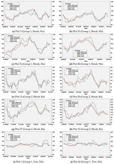 Temporal evolution of observed values (green line) and predicted values (orange line) of LFMC. (a–d): Group 1—Shrub—Weighted average (Wa); (e–h): Group 2—Shrub—Rosmarinus officinalis (Ro); (i,j) Group 1—Tree—Weighted average (Wa). The 95% confidence limits (upper and lower) for the prediction are included in magenta and blue, correspondingly.