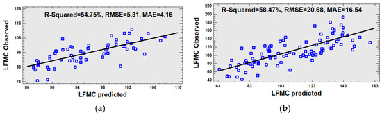 On the other hand, in order to provide more robust evidence of predictive power of the linear regression models described in Table 2, an independent validation using data from different geographical locations in the same time period was performed. Figure 6 shows the results obtained in some plots located in areas classified in the shrub fuel model type. Plot id numbers 15 and 18 are in the thermo-Mediterranean zone and their predicted LFMC weighted average was calculated using the first model described in Table 2. The R2 between the predicted and observed LFMC in these plots was similar to the R2 adjusted of this model, while the RMSE and MAE values were slightly lower. The LFMC predictions of the Rosmarinus officinalis species reached values greater than the LFMC weighted averages, and since most of the errors occurred at extreme values then RMSE and MAE values were higher (Figure 6b). In any case, the values obtained for these statistics are similar to those shown in Table 2 for the model used in the predictions (G = 2, Ft = Sh, Sp = Ro).