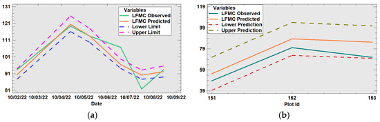 (a) LFMC weighted average in plot id 137 described in Table A3: temporal evolution of observed values (green line), predicted values (orange line), and 95% confidence limits for the mean response of LFMC weighted average model in a shrub plot of the Chelva zone code; (b) observed and predicted values of LFMC for Rosmarinus officinalis species in three plots near Bejís municipality. Observed values in (b) were collected on 17 August 2022, while predicted values were obtained in the same plots on August 8, 2022, before the start of a wildfire. Predicted, observed, and prediction limits (95% of confidence) of LFMC for Rosmarinus officinalis in plot id numbers 151, 152, and 153.