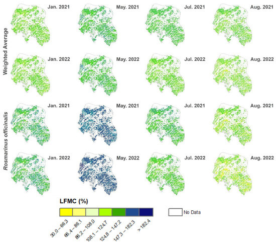 Predicted LFMC maps of the Bejís area (Spain). First two lines correspond to the LFMC weighted average model and lines 3 and 4 belong to LFMC of Rosmarinus officinalis species for months January, May, July, and August of years 2021 and 2022. Estimates were only applied to those areas corresponding to the shrub fuel type.