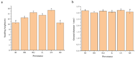 Growth traits of Q. mongolica of different provenances: (a) seedling height; (b) ground diameter. The lines represent the standard error of the mean. Different lowercase letters represent significant differences among seedlings of different provenances (p < 0.05). The same lowercase letter indicates no significant difference.