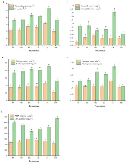 Physiological biochemical indicators of Q. mongolica seedlings of different provenances. (a) Chlorophyll a content and net photosynthetic rate; (b) carotenoid and chlorophyll b contents; (c) nitrogen and soluble sugar contents; (d) phosphorus and soluble protein contents; and (e) abscisic acid (ABA) and indole-3-acetic acid (IAA) contents. The lines represent the standard error of the mean. Different lowercase letters represent significant differences among seedlings of different provenances (p < 0.05). The same lowercase letter indicates no significant difference.