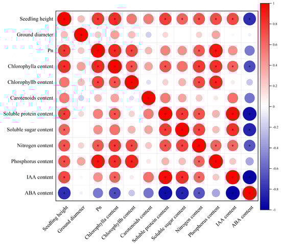 Figure 3 shows the correlation analysis between the growth and physiological biochemical, and darker colors indicate a higher correlation. There were highly significant positive correlations between seedling height and net photosynthetic rate, chlorophyll a, soluble protein, soluble sugar, nitrogen, phosphorus, and IAA contents; between net photosynthetic rate and chlorophyll a, chlorophyll b, nitrogen, and phosphorus contents; and between chlorophyll a, soluble protein, soluble sugar, and nitrogen contents and the IAA content. The nitrogen and phosphorus contents significantly affected the contents of chlorophyll b, soluble protein, and soluble sugar. Except for ABA content, there were positive correlations between various growth and physiological biochemical indicators, while ABA content correlated negatively with various growth and physiological biochemical indicators.