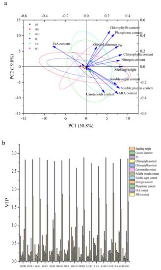 The data on the measured growth and physiological biochemical indicators were standardized and then examined in a chemometrics analysis. The results of a principal component (PC) analysis of the growth and physiological traits of Q. mongolica of different provenances are shown in Figure 4a. PC1 and PC2 accounted for 58.8% and 19.8% of the total variance, respectively, The SD, BJ, and LN provenances were on the positive axis, and the HB, JL, and HLJ provenances were on the negative axis. In PC1, the highest load of IAA content and the IAA content had a negative load and all other physiological traits had positive loads. In PC2, the highest load corresponded to that of the chlorophyll b content and seedling height. The net photosynthetic rate, ground diameter, and the nitrogen, chlorophyll a, phosphorus, chlorophyll b, and IAA contents had positive loads, and soluble sugar, soluble protein, ABA, and carotenoid contents had negative loads. Differences among varieties were distinguished by PC1, and differences with respect to the provenance were distinguished by PC2. In summary, it is possible to distinguish Q. mongolica of different provenances through PC analysis.