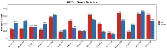 The transcriptome data for Q. mongolica leaves of different provenances were analyzed to identify DEGs (Figure 5). The largest number of DEGs was observed between seedlings of the JL and SD provenances (6918), comprising 3284 differentially upregulated and 3634 differentially down-regulated genes (Figure 5). The smallest number of DEGs was observed between seedlings of the HLJ and LN provenances (1325), comprising 748 differentially upregulated and 577 differentially down-regulated genes. In total, 57,804 DEGs were identified; upregulated DEGs accounted for 50.07% (28,943) and down-regulated DEGs accounted for 49.93% (28,861) of this total. In summary, the difference between JL and SD provenances was the largest, while the difference between HLJ and LN sources was the smallest.