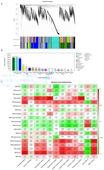 Construction of the weighted gene co-expression network. (a) Gene cluster tree and module cutting. (b) Numbers of genes in the modules. Different colors represent different modules; grey indicates genes not assigned to any module. (c) Correlation analysis between module-trait.