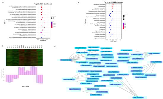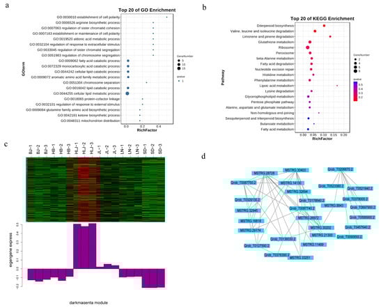 Co-expression network for the darkmagenta module. (a) Gene Ontology (GO) enrichment analyses. (b) Kyoto Encyclopedia of Genes and Genomes (KEGG) enrichment. (c) Heatmap of the expression of genes in the module (top) and expression levels per sample (bottom). (d) Co-expression network of core genes. to Figure 8. Co-expression network for the darkmagenta module. (a) Gene Ontology (GO) enrichment analyses. (b) Kyoto Encyclopedia of Genes and Genomes (KEGG) enrichment. (c) Heatmap of the expression of genes in the module (top) and expression levels per sample (bottom), red represents gene upregulation in the sample, while green represents gene downregulation in the sample. (d) Co-expression network of core genes.