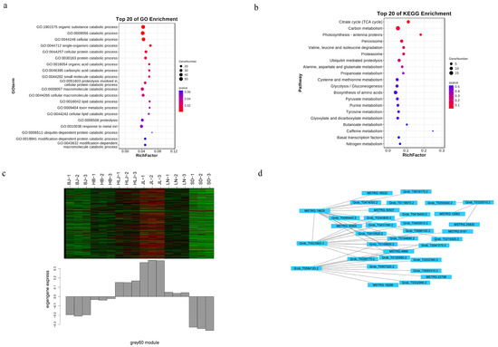 The IAA content of the Q. mongolica seedlings of different provenances correlated negatively with the grey60 (r = −0.88, p = 1 × 10−6, GS = 0.71), plum1 (r = −0.87, p = 3 × 10−6, GS = 0.66), and darkmagenta (r = −0.81, p = 5 × 10−5, GS = 0.63) modules (Figure 6c and Figure 7b). We chose the grey60 module with the highest correlation with IAA content and the highest GS value for a detailed discussion. The genes in the grey60 module were significantly enriched in 106 GO entries, including organic substance catabolic process (GO: 1901575), catabolic process (GO: 0009056), single-organism catabolic process (GO: 0044712), and cell protein catabolic process (GO: 0044257) (Figure 9a). They were also significantly enriched in nine KEGG metabolic pathways, including the citrate cycle, carbon metabolism, photosynthesis-antenna proteins, and peroxisomes (Figure 9b). According to the heatmap of gene expression patterns in the darkmagenta module (Figure 9c), expression in Q. mongolica of the HLJ, JL, and LN (HB, BJ, and SD) provenances showed an upward (downward) trend, which was consistent with the gradual north–south increase in the seedling IAA content. Based on the co-expression network (Figure 9d), four core genes with high connectivity were identified after filtering: Qrob-T0320010.2 (late embryogenesis abundant protein At1g64065-like), MSTRG.19625 (aspartic proteinase-like isoform X1), Qrob-T0523900.2 (chlorophyll a- and -b binding protein 13, chloroplast), and Qrob-T0584120.2 (protein PLASTID TRANSCRIPTIONALLY ACTIVE 16, chloroplastic).