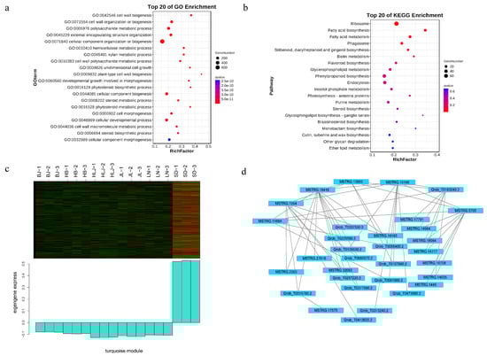 The soluble sugar content of Q. mongolica seedlings of different provenances correlated negatively with genes in the turquoise module (r = −0.85, p = 9 × 10−6, GS = 0.70) (Figure 6c and Figure 7c). These genes were significantly enriched in cell wall biogenesis (GO: 0042546), cell wall organization or biogenesis (GO: 0071554), polysaccharide metabolism process (GO: 005976), external encapsulation structure organization (GO: 0045229), and 264 other GO entries (Figure 10a). They were also significantly enriched in 13 KEGG metabolic pathways, including ribosomes, fatty acid biosynthesis, and phages (Figure 10b). Figure 10c is a heatmap of the expression pattern of each gene in the turquoise module based on all samples. The expression of genes in Q. mongolica of the SD provenance was increased, whereas that in the seedlings of all the other provenances was reduced, which is consistent with the gradual decrease in the soluble sugar content of the seedlings along a north–south gradient. This finding can be explained by the direct or indirect effect of soluble sugar content on the adaptability of plants to cold; higher contents confer greater cold resistance. Figure 10d shows the gene co-expression network for the turquoise module. Seven genes with high connectivity serving as the core gene were identified: MSTRG.1554 (UDP glucoside glycosyltransferase-like), MSTRG.10196 (uclacyanin-3-like), MSTRG.13893 (beta-glucuronosyl transferase GlcAT14C-like), MSTRG.5705 (PREDICTED: pollen-specific protein-like At4g18596), MSTRG.16418 (protein MID1-COMPLEMENTING ACTIVITY 1), MSTRG.11664 (protein HOTHEAD), and Qrob-T0183240.2 (inositol-3-phosphate synthase).