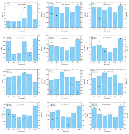 The accuracy and reliability of the transcriptome sequencing results were verified using qRT-PCR. From the 21 core genes screened, 12 genes with relatively high FPKM values were selected for qRT-PCR verification (Supplementary Table S4). The results were highly consistent with the trend of the transcriptome sequencing results; this indicates that the core genes screened in this study are accurate and that the transcriptome sequencing results are reliable (Figure 12).