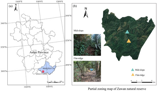 This study was conducted in a natural secondary forest in Zawan Natural Reserve (29°37′05″ N, 117°32′30″ E) in southern Anhui Province, East China (Figure 1). The mean annual temperature (MAT) is 16.6 °C and the mean annual precipitation (MAP) is 1750 mm. The altitude of the study site ranged between 100 and 700 m a.s.l. The soil type is reddish yellow soil, which is classified as Haplic Luvisols according to the Food and Agriculture Organization (FAO) classification [32]. The dominant vegetation type in this natural reserve is evergreen broadleaf forest with the dominant tree species of Castanopsis eyrie (Champ. ex Benth.) Tutcher, Castanopsis sclerophylla (Lindl.) Schottky, Cyclobalanopsis glauca Thunb., Castanea henryi (Skan) Rehder & E. H. Wilson, and the dominant shrub species of Machilus thunbergia Sieb. et Zucc., Symplocos stellaris Brand, Loropetalum chinensis (R. Br.) Oliv., Camellia cuspidate (Kochs) H. J. Veitch Gard. Chron. and Eurya japonica Thunberg. The soil properties and environmental factors of different sites are shown in Table 1.