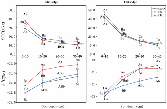 In comparison with SOC content, δ13CSOC was more sensitive to different treatments (Table 2, Figure 2). SOC contents were significantly influenced by sites and soil layers (p < 0.001), and showed a decrease with soil depth (Figure 2). However, the patterns of SOC contents decreased with soil depth not significantly promoted in N and N + P additions at both sites (p > 0.05; Table 1). Only on the mid-slope, SOC content was significantly higher in CK than in N + P addition for the 30–40 cm layer (p < 0.05). In contrast, the δ13CSOC values showed significant differences among treatments, sites, and soil depths, and were also influenced by the two-factor interaction between treatment and site, and depth and site (p < 0.01; Table 2). In both sites, δ13CSOC values showed an increasing trend with soil depth. Moreover, the increasing trend of δ13CSOC values across the soil profile was significantly increased in N and N + P additions on the flat ridge. The δ13CSOC values were significantly higher in N addition than in CK, but they responded to N + P addition differently at two sites. On the mid-slope, δ13CSOC did not vary significantly after N + P addition, but on the flat ridge, the δ13CSOC was significantly higher in N + P addition than in CK (p < 0.05; Figure 2).
