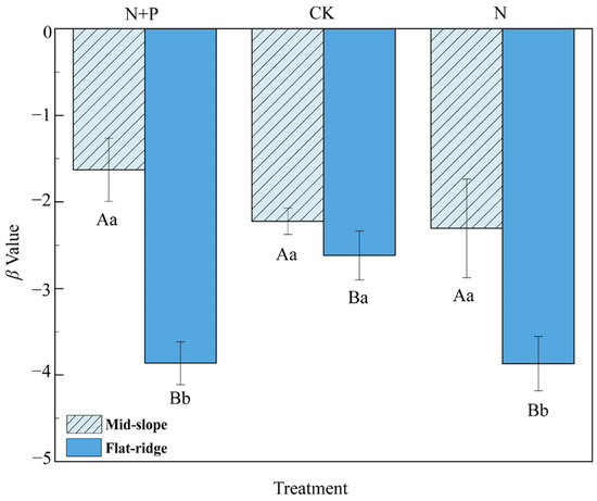 Effect of N and N + P additions on β values at different sites. The uppercase letters indicate differences between sites; the lower case letters indicate differences between treatments (p < 0.05).