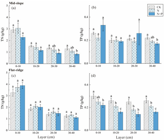Response of soil TN and TP to different N and N + P additions at the two sites. The response of soil total nitrogen (TN) (a), total phosphorus (TP) (b) to different N and N + P additions in the mid-slope, the response of TN (c), TP (d) to different N and N + P additions in the flat ridge. Note: lowercase letters indicate significant differences between treatments in the same soil layer (p < 0.05).