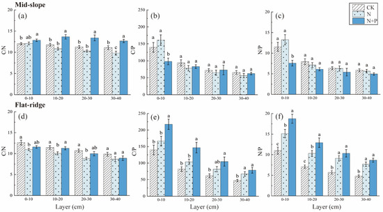 Response of soil C, N and P stoichiometric ratio to N and N + P additions at the two sites. The response of C/N ratio (a), C/P ratio (b), N/P ratio (c)to different N and N + P additions in the mid-slope; the response of C/N ratio (d), C/P ratio (e), N/P ratio (f) to different N and N + P additions in the flat ridge. Note: Lowercase letters indicate significant differences between treatments in the same soil layer (p < 0.05).