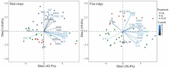 The PCA results showed that the different treatments were grouped on the PC2 axis at the two sites, but clustered in different ways (Figure 6). The top 4 contributors in the PC2 axis were EC, NO3−-N, DON, NH4+-N on the mid-slope, while were β, MBC, TP, and N/P in the PC2 axis on the flat ridge.