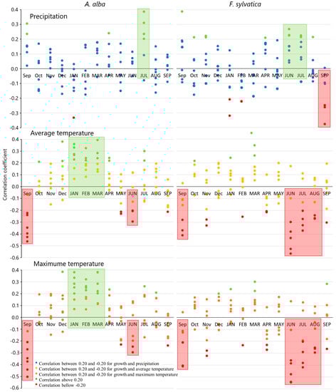 Correlation between fir and beech TRW and climate parameters (all sites). Transparent red and green rectangles mark months or group of months important for tree ring formation.