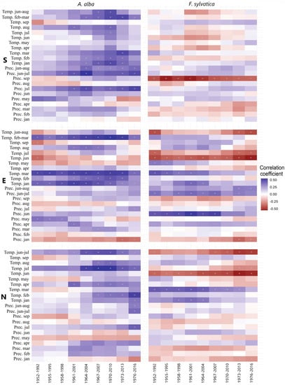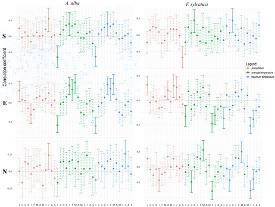 Correlation between fir and beech TRW and climate parameters for southern (S), eastern (E), and northern (N) sites. Solid vertical line shows significant and dotted vertical line unsignificant correlations.