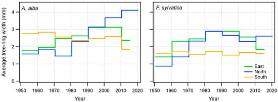 A comparison of average TRW over decades shows the better growth of fir at the northern and eastern sites and a slight decrease at the southern sites. Beech demonstrates more consistent radial growth in the south, but its growth increases less than that of fir on the eastern and northern studied sites.
