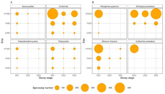 During the fieldwork, detailed information regarding the diameter and decay stage of the associated woody debris pieces was recorded for each fungal specimen. Only a few pieces of debris were identified at a specific level due to obvious difficulties in recognizing fine, decomposed branches. The woody debris was categorized into specific diameter classes based on the classification system established by Küffer and Senn-Irlet [] and Abrego and Salcedo []. These categories include: