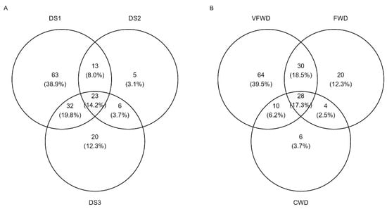 Venn diagrams of species diversity. In (A), circles indicate the different decay stage types analysed: DS1, first decay stage; DS2, second decay stage; and DS3, third decay stage. In (B), circles indicate the different woody sizes: VFWD, very fine woody debris; FWD, fine woody debris and CWD, coarse woody debris. Numbers inside the circles indicate the number of species while overlapping areas demonstrate the shared number of species.