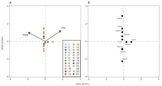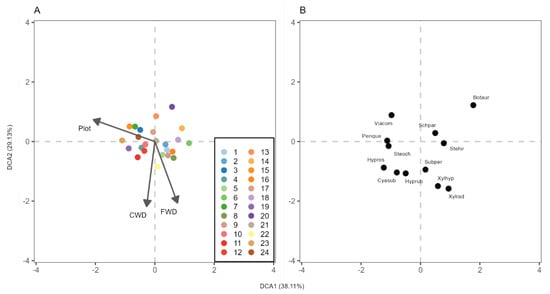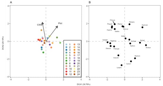 Detrended correspondence analysis (DCA) of Ascomycota sporocarp community composition across plots. In (A), the studied plots are indicated with different dot colors while both Plot variable and the significant deadwood variables are indicated with arrows. In (B), the most abundant species are represented. The percentage of variance explained by each DCA axis is in parentheses. Abbreviations of fungal species shown in the DCA diagram: Calcit—Calycina, Didrad—Diderma radiatum, Hymcal—Hymenoscyphus calyculus, Hyprub—Hypoxylon rubiginosum, Lacvir—Lachnum virgineum, Orbxan—Orbilia xanthostigma, Profra—Propolis farinosa, Sarcoc—Sarcoscypha coccinea, Scuker—Scutellinia kerguelensis, Xylhyp—Xylaria hypoxylon.