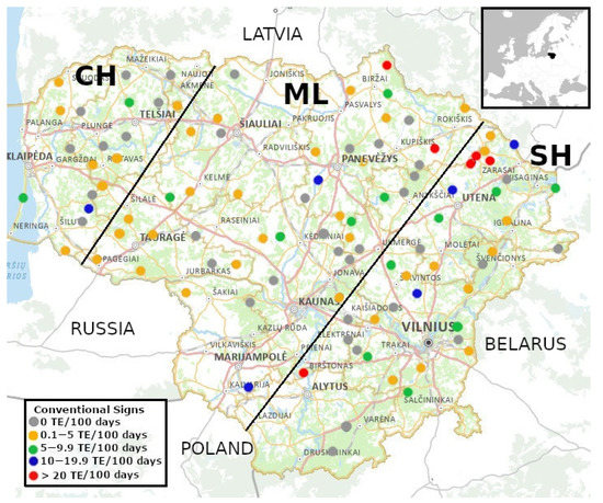 Locations of camera sites in Lithuania (CH—Coastal Highlands, ML—Middle Lowlands, SH—South-Eastern Highlands) and relative shooting frequency of raccoon dogs.