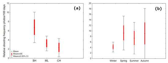The lowest seasonal activity of the raccoon dog was observed in winter (Figure 2b), with 4.19 (CI = 2.65–5.73) photos/100 days. Activity indices in the other seasons are similar and higher than that in winter (G = 31.0, df = 1, p < 0.001).