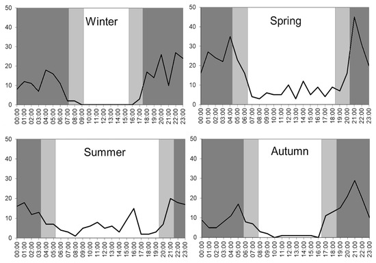 The daily activity of raccoon dogs in different seasons (nighttime—dark grey area, twilight—light grey area, daytime—white area, defined as an average time for each season).