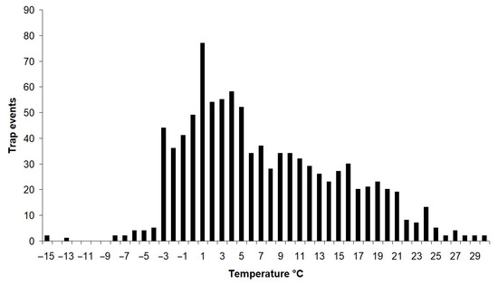 No raccoon dog activity was recorded below −15 °C, while activity below −4 °C and above 25 °C was very low (Figure 5). The highest activity of raccoon dogs was recorded at temperatures ranging from −3 °C to 5 °C. From +1 °C onwards, raccoon dog activity decreased steadily as the temperature increased.