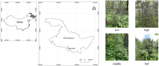 Study area map (left: pictures) and Korean pine trees under different light conditions (right: photos).