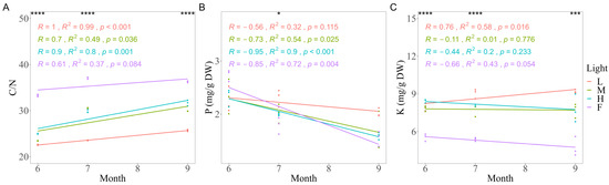 The correlations of C/N (A), P (B), and K (C) concentrations were measured in needles of Korean pine trees for a month under different light conditions at three sampling times. L is the abbreviation of low light, M for moderate light, H for high light, and F for full light. * p < 0.05 *** p < 0.001, **** p < 0.0001, ns was omitted; 6, 7, and 9 represent June, July, and September, respectively.