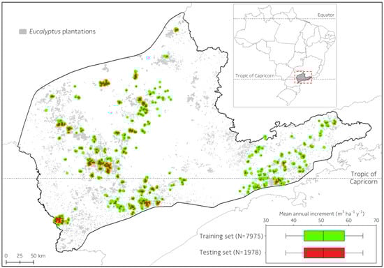 Distribution of Eucalyptus plantations (light gray), modified from the Spatial Database of Planted Trees [30] and Suzano’s network with 9953 (7975 for training set and 1978 for testing set) Eucalyptus permanent forest inventory plots used for the decision-tree modeling. Training and test datasets are very similar in terms of distribution, median, and quartiles of wood productivity.