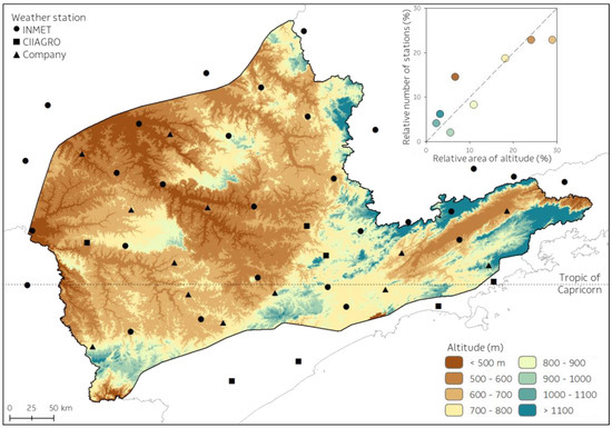 Digital elevation model (meters above mean sea level) composed of SRTM tiles, and the network of weather stations used in this study provided by INMET (Brazilian National Institute of Meteorology), CIIAGRO (Integrated Center of Agrometeorological Information of Campinas Institute of Agronomy), and from the forest company. The upper small plot shows the distribution of weather stations in the study area according to their altitude strata.