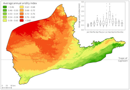 Average annual aridity index obtained is ratio of annual potential evapotranspiration and annual rainfall and is spatially calculated by both respective maps. The higher the index, the more arid the environment. The boxplot shows the distribution of calculated monthly aridity index, which is the ratio of annual potential evapotranspiration and annual rainfall observed on the weather stations used in this study.