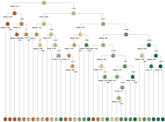 Recursive partitioning model is displayed as a decision tree showing the classification for Eucalyptus forest zone productivity. Node color ramp corresponds with those displayed also in Figure 7, Figure 8, Figure 9 and Figure 10 and Table 1. The integer and percentages values inside nodes represent, respectively, the average total wood volume at 6 years old and proportion of observations from the root node (training dataset) in each internal or leaf (terminal) node. Texts outside nodes are predictor variables used in the decision-tree modeling and classification of Eucalyptus forest zone productivity. Aridity = discretized aridity index on the 0.015 scale; Order = qualitative polytomous variable denoting the soil order, see Section 2.5 to learn symbols used in this study and representing the Brazilian Soil Classification System; Texture = qualitative polytomous variable denoting the soil texture, see Section 2.5 to learn symbols used in this study and covering the soil texture interpretation of Brazilian Soil Classification System; Altitude = elevation above mean sea level discretized on the 10 m scale.