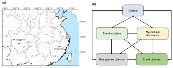 Location of the study sites (a) and a conceptual model linking species diversity, stand biomass, and the biotic and abiotic factors (b).