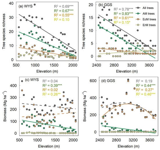 Elevational patterns of tree species richness and biomass on Mt. Wuyishan (a,c) and Mt. Gonggashan (b,d) in subtropical China. WYS, Mt. Wuyishan; GGS, Mt. Gonggashan; AM, arbuscular mycorrhizae; EcM, ectomycorrhizae; ErM, ericoid mycorrhizae. Solid and dotted lines indicate significant (p < 0.05) and insignificant relationships (p > 0.05), respectively. * p < 0.05; ** p < 0.01; *** p < 0.001.