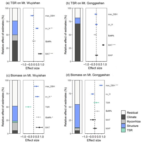 Relative influences of biotic and abiotic variables on tree species richness and biomass on Mt. Wuyishan (a,c) and Mt. Gonggashan (b,d). In each panel, the left part is the relative contribution of different groups of variables, and the right part is the standardized coefficients from multiple linear regressions estimated separately for each variable. MAP, mean annual precipitation; MAT, mean annual temperature; EcM%, ectomycorrhizal dominance; cv_H, tree height variation; max_DBH, maximum diameter at breast height; TSR, tree species richness. The bars indicate a 95% confidence interval. * p < 0.05; ** p < 0.01; *** p < 0.001.