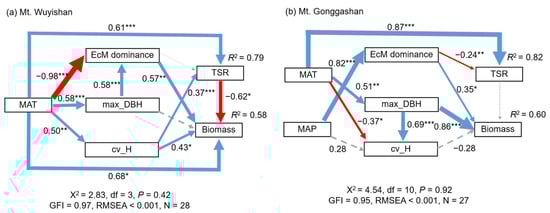 Structure equation models (SEMs) examining the multivariate relationships of stand biomass, tree species richness, stand structural attributes, mycorrhizal dominance, and climate on Mt. Wuyishan (a) and Mt. Gonggashan (b). Blue and red arrows indicate positive and negative effects, respectively. Dashed arrows in grey indicate insignificant effects. Arrow width is proportional to the standardized path coefficient. MAT, mean annual temperature; MAP, mean annual precipitation; EcM, ectomycorrhizae; cv_H, variation of tree height; max_DBH, maximum diameter at breast height; TSR, tree species richness. * p < 0.05; ** p < 0.01; *** p < 0.001.