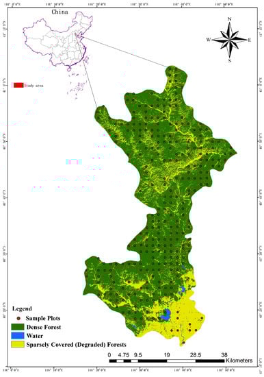 The study area is located in Huairou District, Beijing City, China, and the distribution of the sampling plots.