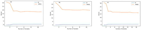 As shown in Table 4, this study used Landsat 8 and Sentinel-2 images, and selected Landsat 8 and Sentinel-2, as well as feature variable combinations using linear stepwise regression (LSR) and recursive feature elimination (RFE) methods, respectively. With Landsat 8 as the image source, nine feature variables were selected using LSR, including multi-spectral bands; (Figure 2) shows that the maximum coefficient of determination and the minimum root mean squared error () were achieved when the number of variables was three, as selected by RFE. Nine feature variables were ultimately selected. Using Sentinel-2 as the image source, LSR selected five feature variables; by using RFE selection, when the number of variables was three (Figure 2), the coefficient of determination of the model reached its maximum and both and root mean squared error () reached its minimum. As a result, nine feature variables were ultimately screened. To study the joint ability of Landsat 8 data and Sentinel-2 data to invert the volume, in this experiment, the resolution of the two satellite images was both set to 25.8 m during resampling, which was used to match the sample sites. By combining Sentinel-2 and Landsat 8 remote sensing variables, nine feature variables were selected after LSR screening; using RFE selection, when the number of variables is five (Figure 2), the determination coefficient of the model reaches its maximum, and at the same time, and reach their minimum. Finally, 10 feature variables are selected.