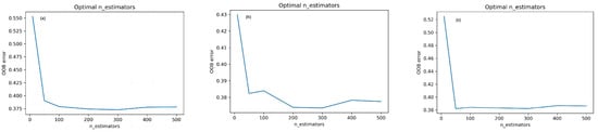 Optimal hyperparameters are shown in Figure 3a–c for the Random Forest models. The number of estimators was varied to observe the effect on the out-of-bag (OOB) error. It is notable that the Landsat 8-based RF model had the lowest out-of-bag error when 310 estimators were used. For the Sentinel-2 based RF model, 280 estimators resulted in the lowest out-of-bag error. The joint variable data of Landsat 8 and Sentinel-2 resulted in the lowest out-of-bag error when 265 estimators were used.