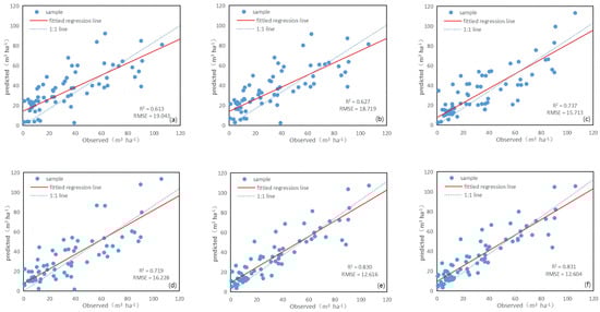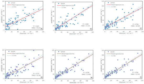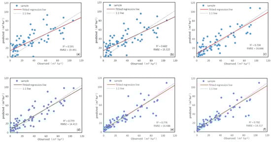 Scatter plots of the observed and predicted FSV values by: (a) Landsat 8–Sentinel-2 LSR-MLR (b) Landsat 8–Sentinel-2 RFE-MLR (c) Landsat 8–Sentinel-2 LSR-BP (d) Landsat 8–Sentinel-2 RFE-BP (e) Landsat 8–Sentinel-2 LSR-RF (f) Landsat 8–Sentinel-2 RFE-RF.