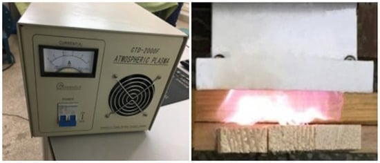 A CTD-2000F plasma device (Suman plasma, Nanjing, China) was turned on to perform treatment on PM wood with the size of 30 mm × 25 mm × 10 mm (Figure 1). The treatment time was a variable factor, being 1 min, 2 min, and 4 min. Considering the time effect of plasma treatment, 24 specimens for each treating time were tested and used within 30 min.