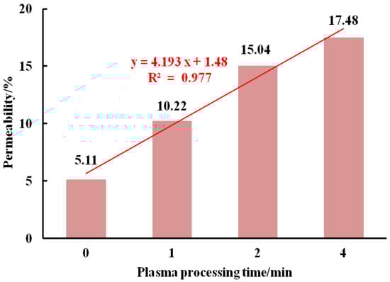 The effect of plasma treatment of MUF permeation on the surface of PM wood is shown in Figure 3. The permeation rate without plasma treatment was only 5.11%, which was attributed to the hydrophobic and nonpolar rosin on the surface of PM wood. The permeation rate increased linearly with the extension of plasma treatment time (y = 4.193x + 1.48, R2 = 0.977). This was because with the increase in plasma treatment time, the longer the interaction time between high-energy particles of plasma and the surface of PM wood, the more obvious the physical and chemical effects of plasma on the surface of PM wood. On the one hand, the etching effect and the roughness of the surface were improved, and the diffusion of MUF on the surface was accelerated. On the other hand, the more the polar groups were introduced on the wood surface, the higher the affinity between MUF and wood surface, and the faster the diffusion of MUF on the surface [39,40]. Wood is a porous material, and adhesives can penetrate into the inner cavity of wood (pits and cell cavities) to form glue-nails, which is the premise and key for glued wood to obtain excellent bonding strength. The permeability of PM wood treated by plasma was significantly enhanced, which laid a good foundation for PM wood to achieve good bonding performance.