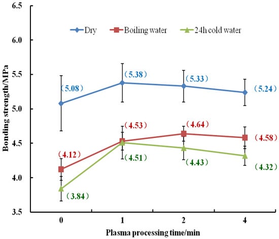 As shown in Figure 4, the dry bonding strength, boiling-water bonding strength, and cold-water bonding strength of PM glued wood without plasma treatment were 5.18, 4.22, and 3.84 MPa, respectively, while those of PM glued wood after plasma treatment were evidently improved, but the strength values changed little between plasma treatment times of 1, 2, and 4 min.