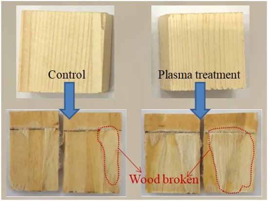 The wet peeling rate can show the bonding stability of glued wood. From Table 1, it can be seen that the total peeling rate and the maximum at the glue line of untreated PM glued wood in boiling water were 18.77% and 37.62%, respectively; however, peeling did not occur for PM glued wood after plasma treatment. In addition, as shown in Figure 5, the PM glued wood with plasma treatment had a higher wood failure rate, which proved that plasma treatment of PM wood can not only improve the bonding strength, but also improve the bonding stability and reliability of glued wood.